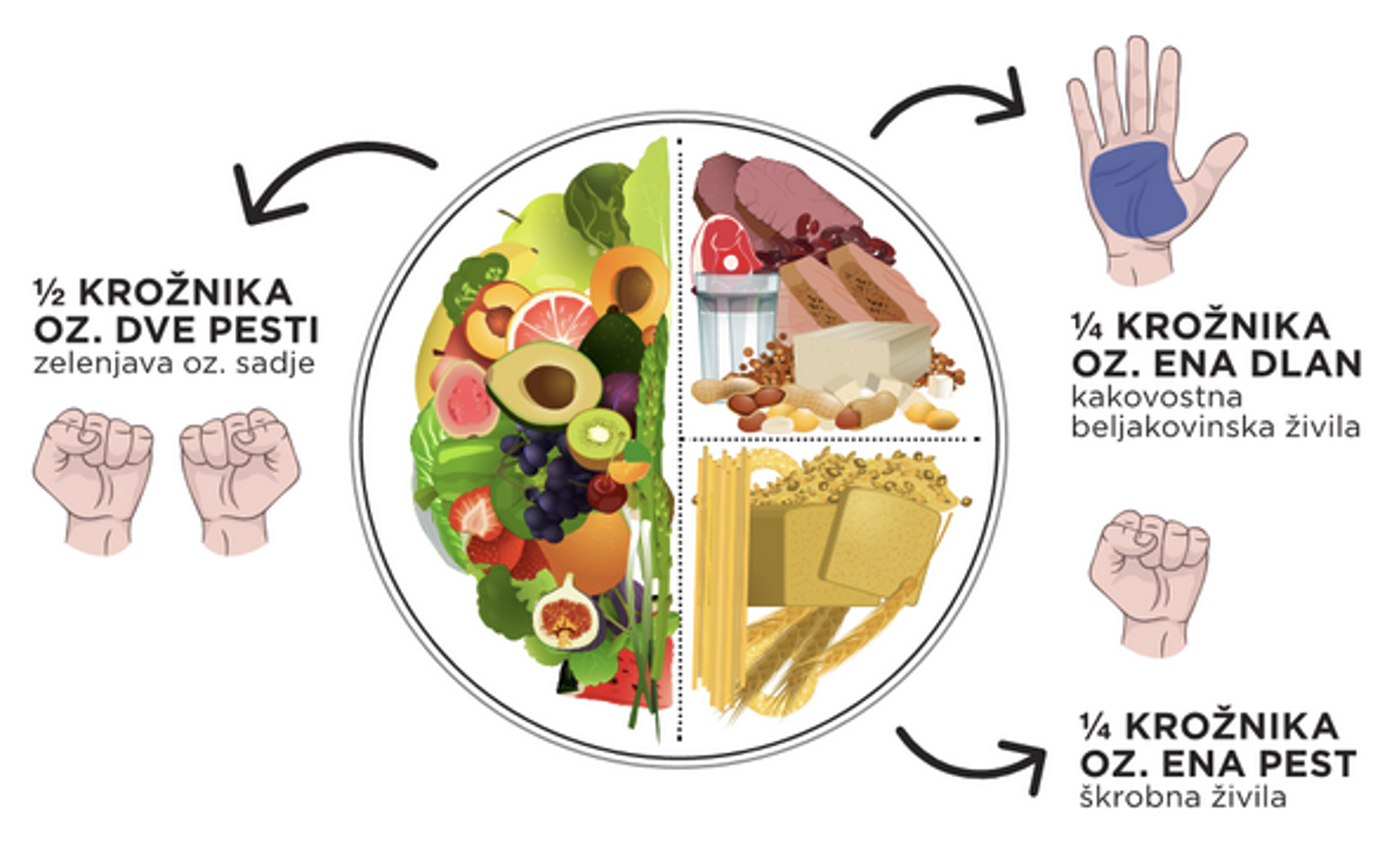 Pri sestavljanju obroka si lahko pomagamo s preprostim pravilom krožnika, kot je prikazano na sliki. Krožnik razdelimo na tri dele: polovico naj predstavljata zelenjava in/ali sadje, četrtino škrobna živila (npr. krompir, riž, testenine ali kruh – pri čemer naj bo vsaj polovica žitnih izdelkov polnozrnatih), četrtino pa beljakovinska živila, kot so meso, ribe, jajca, mlečni izdelki ali stročnice.