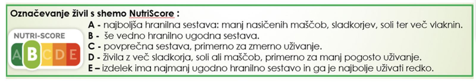 Raziskave slovenskih avtorjev kažejo, da Nutri-Score omogoča hitrejše odločitve pod časovnim pritiskom, vendar je za spodbujanje zdravih izbir v Sloveniji še učinkovitejši prehranski semafor iz aplikacije Veš, kaj ješ, kar potrjuje pomen potrošnikom poznanih in razumljivih oznak [3].