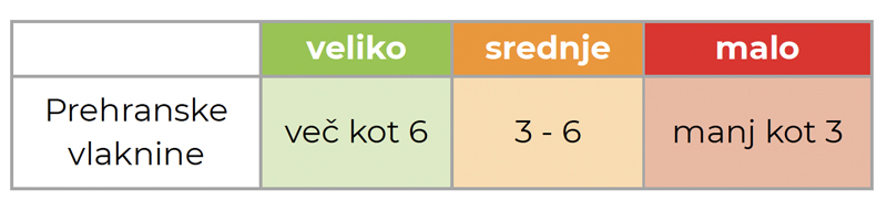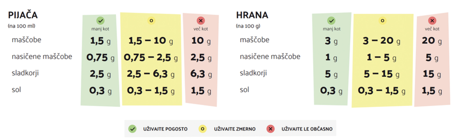 🔴 Rdeča – visoka vsebnost; živilo je priporočljivo uživati le občasno in v manjših količinah.