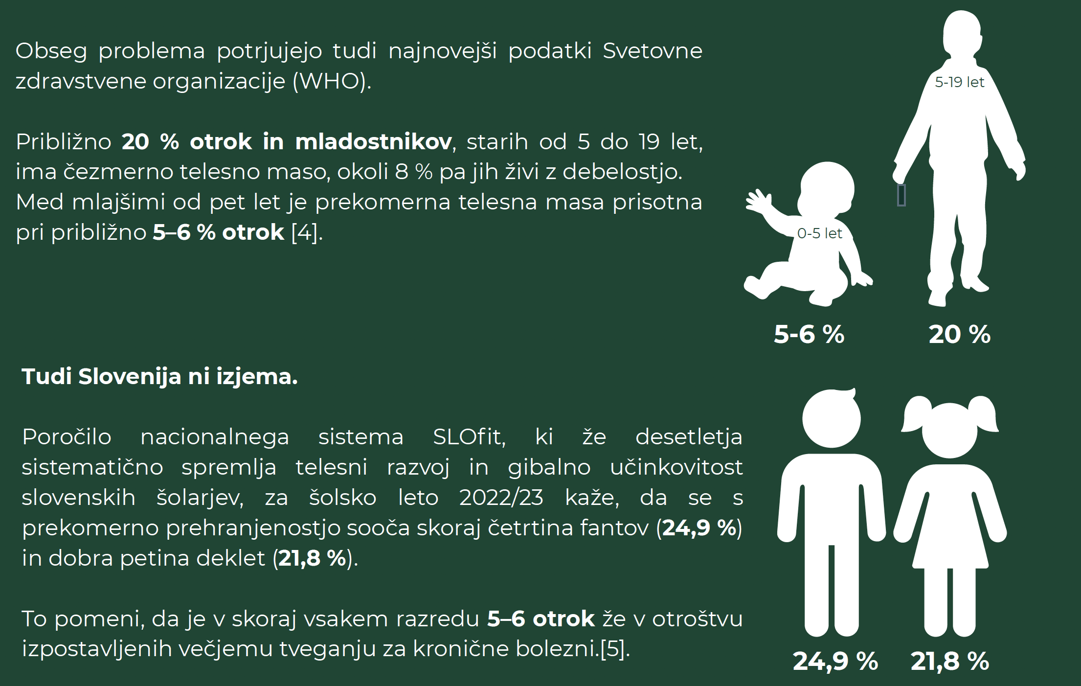 Tudi Slovenija ni izjema. Poročilo nacionalnega sistema SLOfit, ki že desetletja sistematično spremlja telesni razvoj in gibalno učinkovitost slovenskih šolarjev, za šolsko leto 2022/23 kaže, da se s prekomerno prehranjenostjo sooča skoraj četrtina fantov (24,9 %) in dobra petina deklet (21,8 %). To pomeni, da je v skoraj vsakem razredu 5–6 otrok že v otroštvu izpostavljenih večjemu tveganju za kronične bolezni.[5].